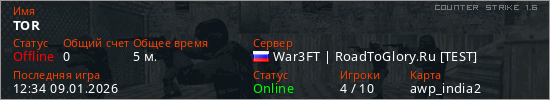 Играет на Counter Strike 1.6 сервере. Страна: РоссияПервый раз замечен 12:32 09.01.2026