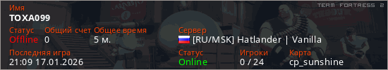 Играет на Team Fortress 2 сервере. Страна: РоссияПервый раз замечен 20:56 17.01.2026