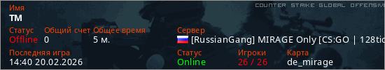 Играет на Counter Strike Global Offensive сервере. Страна: РоссияПервый раз замечен 13:39 20.02.2026