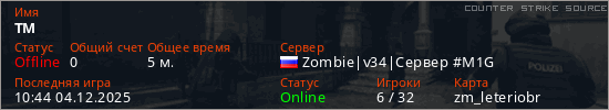 Играет на Counter Strike Source сервере. Страна: РоссияПервый раз замечен 10:23 04.12.2025