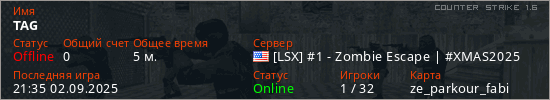 Играет на Counter Strike 1.6 сервере. Страна: СШАПервый раз замечен 21:32 02.09.2025