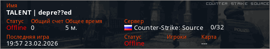 Играет на Counter Strike Source сервере. Страна: РоссияПервый раз замечен 19:46 23.02.2026