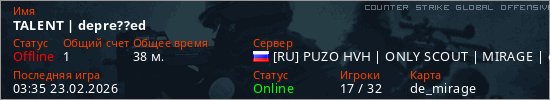 Играет на Counter Strike Global Offensive сервере. Страна: РоссияПервый раз замечен 00:56 22.02.2026