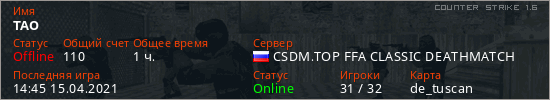 Играет на Counter Strike 1.6 сервере. Страна: РоссияПервый раз замечен 22:32 13.12.2019