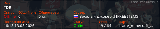 Играет на Team Fortress 2 сервере. Страна: РоссияПервый раз замечен 16:11 13.03.2026