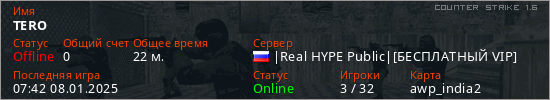 Играет на Counter Strike 1.6 сервере. Страна: РоссияПервый раз замечен 17:53 06.01.2025