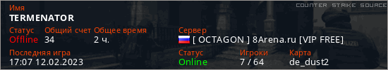 Играет на Counter Strike Source сервере. Страна: РоссияПервый раз замечен 11:34 19.03.2021
