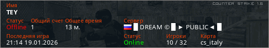 Играет на Counter Strike 1.6 сервере. Страна: РоссияПервый раз замечен 03:54 19.01.2026