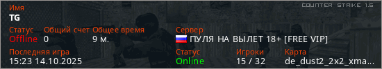 Играет на Counter Strike 1.6 сервере. Страна: РоссияПервый раз замечен 14:24 12.10.2025
