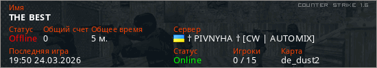 Играет на Counter Strike 1.6 сервере. Страна: УкраинаПервый раз замечен 19:48 24.03.2026