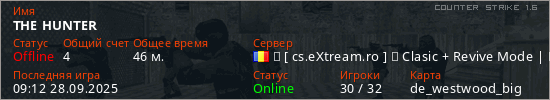 Играет на Counter Strike 1.6 сервере. Страна: РумынияПервый раз замечен 20:42 15.08.2025