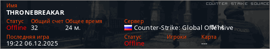 Играет на Counter Strike Source сервере. Страна: РоссияПервый раз замечен 16:39 05.12.2025