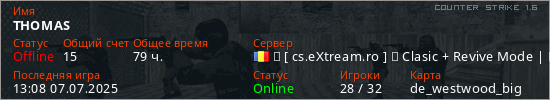 Играет на Counter Strike 1.6 сервере. Страна: РумынияПервый раз замечен 05:56 19.01.2025