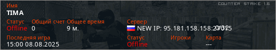 Играет на Counter Strike 1.6 сервере. Страна: РоссияПервый раз замечен 13:33 08.08.2025