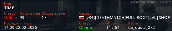 Играет на Counter Strike Source сервере. Страна: РоссияПервый раз замечен 00:31 06.02.2026