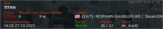 Играет на Counter Strike 1.6 сервере. Страна: СШАПервый раз замечен 01:58 10.10.2025