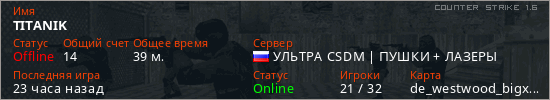 Играет на Counter Strike 1.6 сервере. Страна: РоссияПервый раз замечен 04:08 10.01.2026