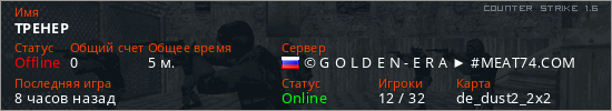 Играет на Counter Strike 1.6 сервере. Страна: РоссияПервый раз замечен 22:06 26.03.2026