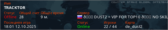 Играет на Counter Strike Global Offensive сервере. Страна: РоссияПервый раз замечен 17:15 12.10.2025