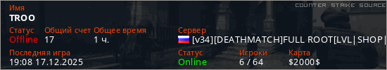 Играет на Counter Strike Source сервере. Страна: РоссияПервый раз замечен 15:11 23.07.2025