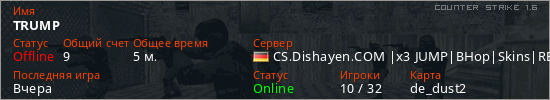 Последний раз был в сети Вчера Игрок с таким ником замечен на 32 серверах
