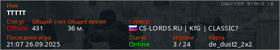 Играет на Counter Strike 1.6 сервере. Страна: РоссияПервый раз замечен 12:02 30.12.2024
