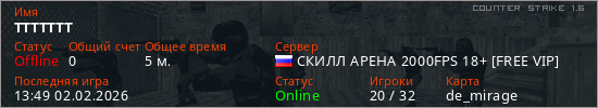 Играет на Counter Strike 1.6 сервере. Страна: РоссияПервый раз замечен 13:47 02.02.2026