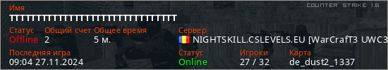 Играет на Counter Strike 1.6 сервере. Страна: РумынияПервый раз замечен 09:02 27.11.2024