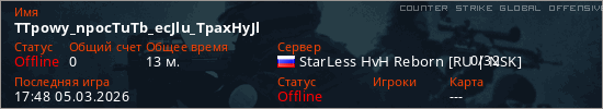 Играет на Counter Strike Global Offensive сервере. Страна: РоссияПервый раз замечен 12:01 05.03.2026