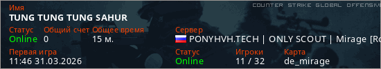 Играет на Counter Strike Global Offensive сервере. Страна: РоссияПервый раз замечен 11:46 31.03.2026