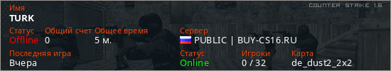 Играет на Counter Strike 1.6 сервере. Страна: РоссияПервый раз замечен 21:02 08.03.2026