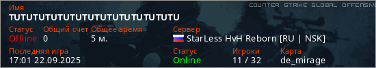 Играет на Counter Strike Global Offensive сервере. Страна: РоссияПервый раз замечен 16:59 22.09.2025