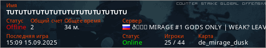 Последний раз был в сети 15:09 15.09.2025 Игрок с таким ником замечен на 5 серверах