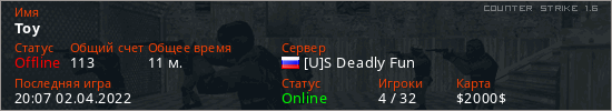 Играет на Counter Strike 1.6 сервере. Страна: РоссияПервый раз замечен 19:58 02.04.2022