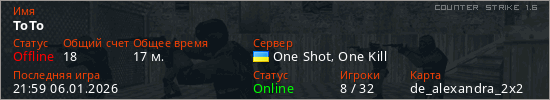 Играет на Counter Strike 1.6 сервере. Страна: УкраинаПервый раз замечен 17:10 06.01.2026