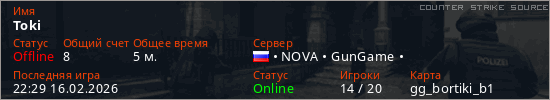 Играет на Counter Strike Source сервере. Страна: РоссияПервый раз замечен 22:25 16.02.2026
