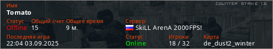 Играет на Counter Strike 1.6 сервере. Страна: РоссияПервый раз замечен 21:21 03.09.2025