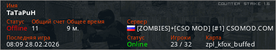 Играет на Counter Strike 1.6 сервере. Страна: РоссияПервый раз замечен 18:24 27.02.2026