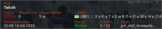 Играет на Counter Strike 1.6 сервере. Страна: УкраинаПервый раз замечен 22:02 16.04.2026
