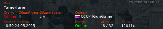 Играет на Counter Strike 1.6 сервере. Страна: РоссияПервый раз замечен 18:31 24.05.2025
