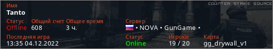 Играет на Counter Strike Source сервере. Страна: РоссияПервый раз замечен 18:21 12.08.2022