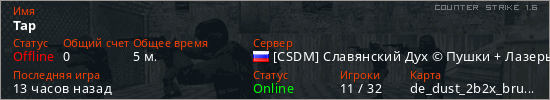 Играет на Counter Strike 1.6 сервере. Страна: РоссияПервый раз замечен 02:20 06.04.2026