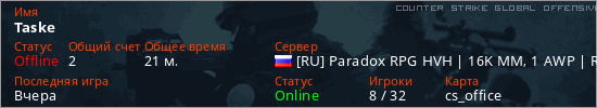 Играет на Counter Strike Global Offensive сервере. Страна: РоссияПервый раз замечен 16:59 08.03.2026