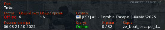 Играет на Counter Strike 1.6 сервере. Страна: СШАПервый раз замечен 01:58 14.09.2025