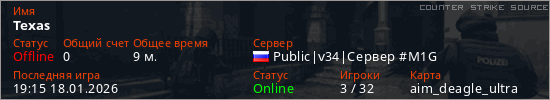 Играет на Counter Strike Source сервере. Страна: РоссияПервый раз замечен 14:05 18.01.2026