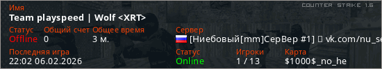 Играет на Counter Strike 1.6 сервере. Страна: РоссияПервый раз замечен 22:02 06.02.2026