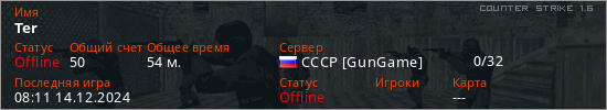 Играет на Counter Strike 1.6 сервере. Страна: РоссияПервый раз замечен 09:57 27.09.2024