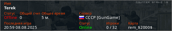 Играет на Counter Strike 1.6 сервере. Страна: РоссияПервый раз замечен 20:55 08.08.2025