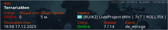 Играет на Counter Strike Global Offensive сервере. Страна: КазахстанПервый раз замечен 19:55 17.12.2025