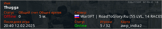 Играет на Counter Strike 1.6 сервере. Страна: РоссияПервый раз замечен 20:38 12.02.2025